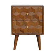 - Chestnut Cube Carved Nightstand - The main feature of this nightstand is the hand carved cube drawer fronts which make the pieces from this collection stand out. It has been constructed from 100% solid mango wood in a chestnut finish and stands on 4 Nordic style legs. It can be partnered with the other pieces from the range or stand individually as its style is versatile and can fit into different types of interiors.