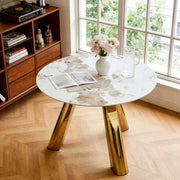 This dining table features a 42-inch white marble-style top that is not only aesthetically pleasing but also practical with its heat and wear resistance, embodying the concept of environmental protection. The natural brown veins on the table add a touch of warmth and elegance, making every dining experience a pleasure.