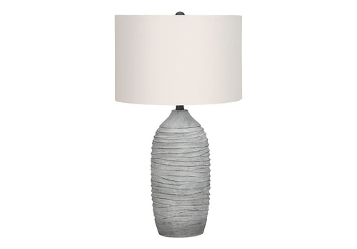 View full detailsModern Design: Vase-like shape with textured grey resin body, flowing lines, and an ivory linen drum shade, topped with a black round finial. ...