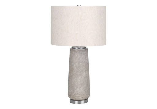 View full detailsModern Design: Features a subtly textured grey resin cylinder base with polished silver metal footing and an ivory linen drum shade topped with...