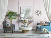 - Artistic Design: Features a contemporary metal sculpture with a golden and white color scheme.