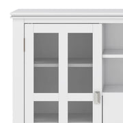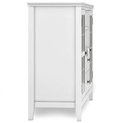 - Features two (2) central drawers with metal glides, open center area with adjustable shelf and two (2) side tempered glass framed doors that open to large storage spaces with two (2) shelves each