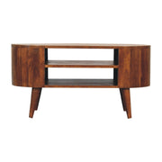 - Cortez Chestnut Media Unit - This elegant and modern media unit is made from 100% solid mango wood, it's minimalist design is bound to complement any living room decor. The spacious tabletop provides ample space for your TV, ornaments or other essentials, while the 2 open shelves offer convenient storage for books, magazines, and other items.