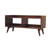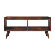 - Open-top Chestnut Media Unit - Introducing our Open Top Chestnut Console, crafted from 100% solid mango wood in a chestnut finish. With its clean, modern design featuring Nordic-style legs, it adds contemporary charm to any space. This versatile piece includes a top shelf for displaying decor or holding glasses, along with an open space below for convenient storage. Elevate your home with the practical elegance of this console table today.