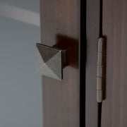 - Contemporay design features floating square edged top, square knobs with bronze finish and square tapered legs.
