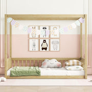 Twin Size Canopy Frame Floor Bed With Fence, Guardrails - Natural