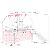 Jack - House Twin Loft Bed With Slide And Curtain Set - White / Pink