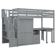 Twin Size Loft Bed With Stairs, Bookshelf, Drawers, Desk & Wardrobe, Space Saving Multifunctional Furniture - Gray