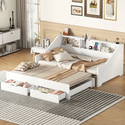 Twin To King Daybed Frame With Storage Bookcases And 2 Drawers, Charging Station - White