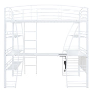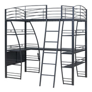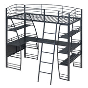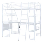 Crafted from metal with a clean painted finish, this metal loft bed strikes a clean-lined silhouette with curved slatted guardrails. This bold and imaginative design easily captures attention and complements your room decor. The four-layer open shelves offer ample space to display whatever you want, including lamps, books, and toys. For your convenience, a set of sockets, USB ports, and wireless charging is equipped on the desk, saving you the hassle of charging your phone and tablet while you work or read. Equipped with a large L-shaped desk, this bed provides a comfortable place to work, read, and enjoy yourself. I am sure that this imaginative loft bed can create your little wonderful world.