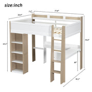 Full Size Loft Bed With Built In Storage Shelves, Clothes Rail, And Desk - White / Natural