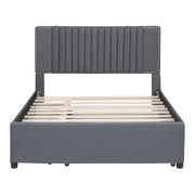 Queen Size Upholstered Platform Bed With 2 Drawers And 1 Twin Long Trundle, Classic Headboard Design - Gray
