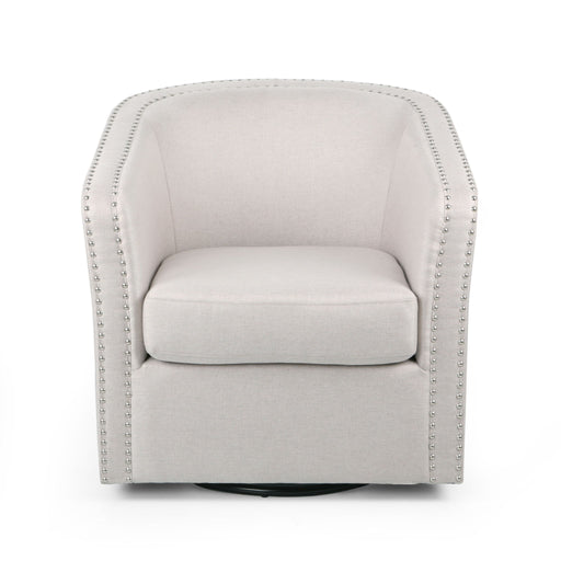 View full detailsCONTEMPORARY DESIGN: Showcasing nailhead trims and a classic tub shape, this swivel chair embodies a truly contemporary style. BARREL CLUB CHAIR: ...