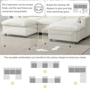 Modular Sectional With Storage Pockets, 5 Seat U Shaped Couch Set With Pillows Free Combination Modern Cloud Sofa With 2 Movable Ottoman - White