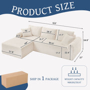 Full Compression Chaise Lounge Set Modular Corduroy Sectional With Arched Armrests Non Slip Base Includes 3 Back Cushions & 2 Throw Pillows - White