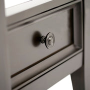 - Transitional design includes tapered legs, molded crown edged table top, panel framed drawer fronts and antique bronze round decorative knobs