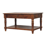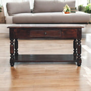 - Turned legs Drawer Table - Classic elegance meets functional design in this beautifully handcrafted table, made from 100% Solid Mango Wood in a rich finish. Featuring gracefully turned legs, a single compact drawer with a brass knob for discreet storage, and a lower shelf for added convenience, this piece blends traditional craftsmanship with modern practicality. Its timeless appeal makes it a perfect addition to bedrooms, living spaces, or hallways adding warmth and sophistication to any home. Sturdy, sustainable, and stylish, this side table is a testament to fine woodworking and refined aesthetics.