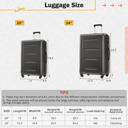 Size: 20 IN luggage dimensions(included accessories): 13"x8.9"x20.5";24 IN luggage dimensions(included accessories):15.5"x10.4"x24.4"; Expandable travel bag dimensions :longest length: 23", shortest length: 15.7", width: 8.3", height(without extension): 12.2", expansion part height: 3.9";Toiletry bag dimensions: 10 "x5.5"x4".